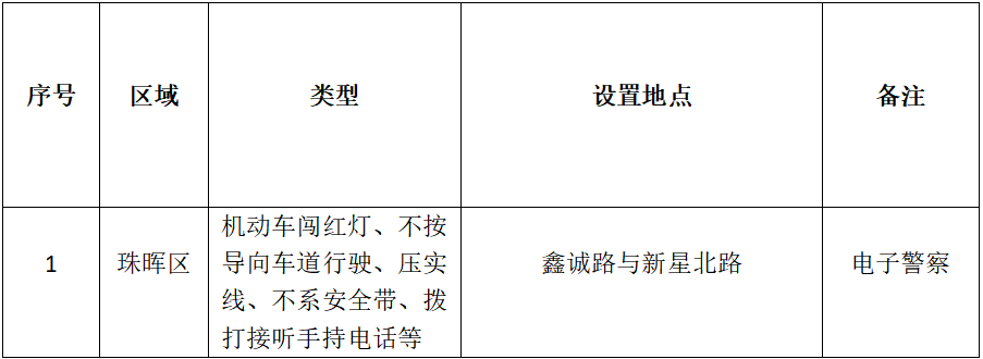 为保障道路交通安全、有序、畅通,预防和减少交通事故的发生,促进市民安全文明出行。衡阳市公安局交通警察支队将新增安装启用1处电子监控设备,抓拍具体违法行为有:机动车闯红灯、不按导向车道行驶、压实线、不系安全带、拨打接听手持电话等。现将新设置的电子监控设备抓拍点公告如下: